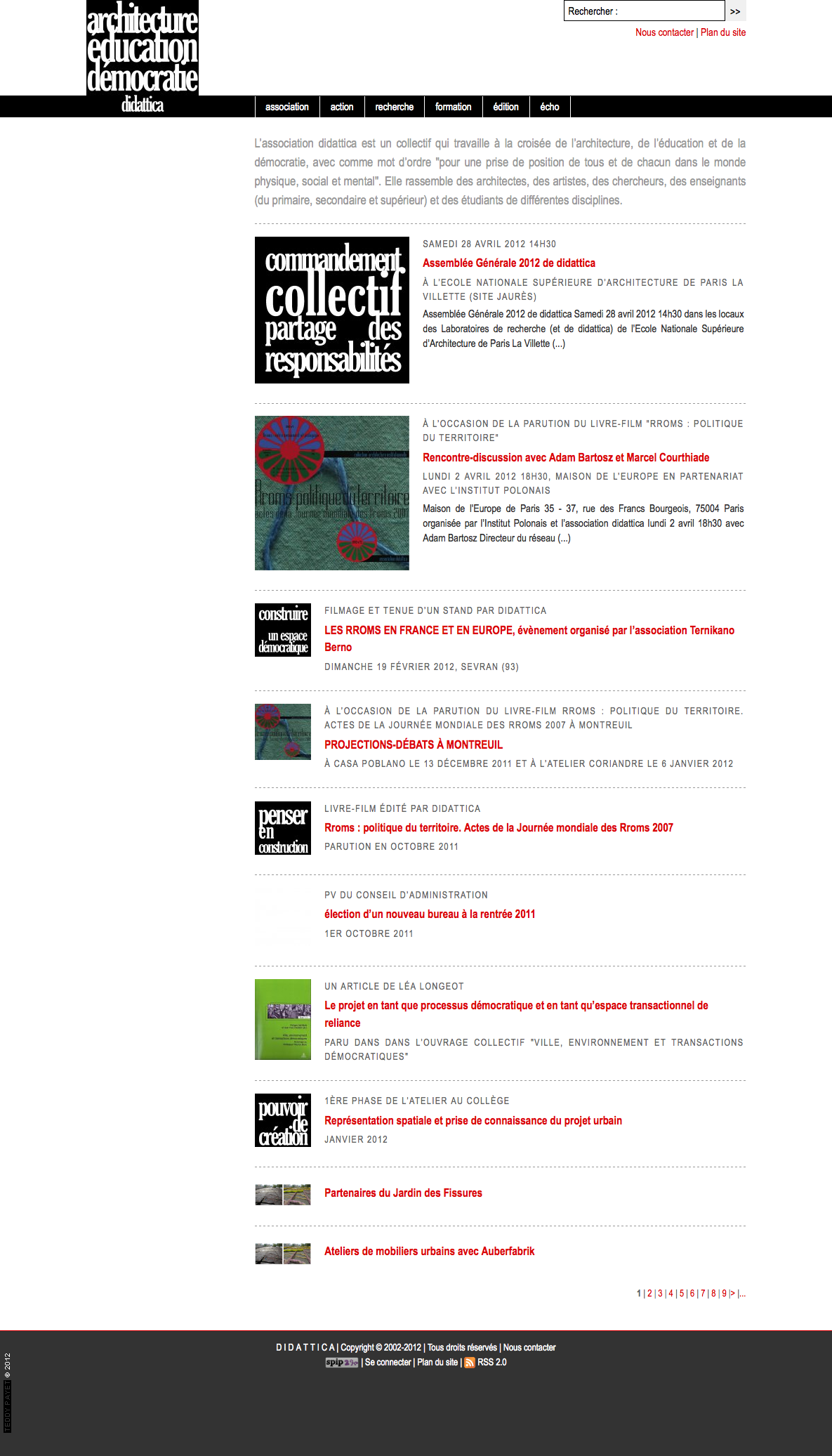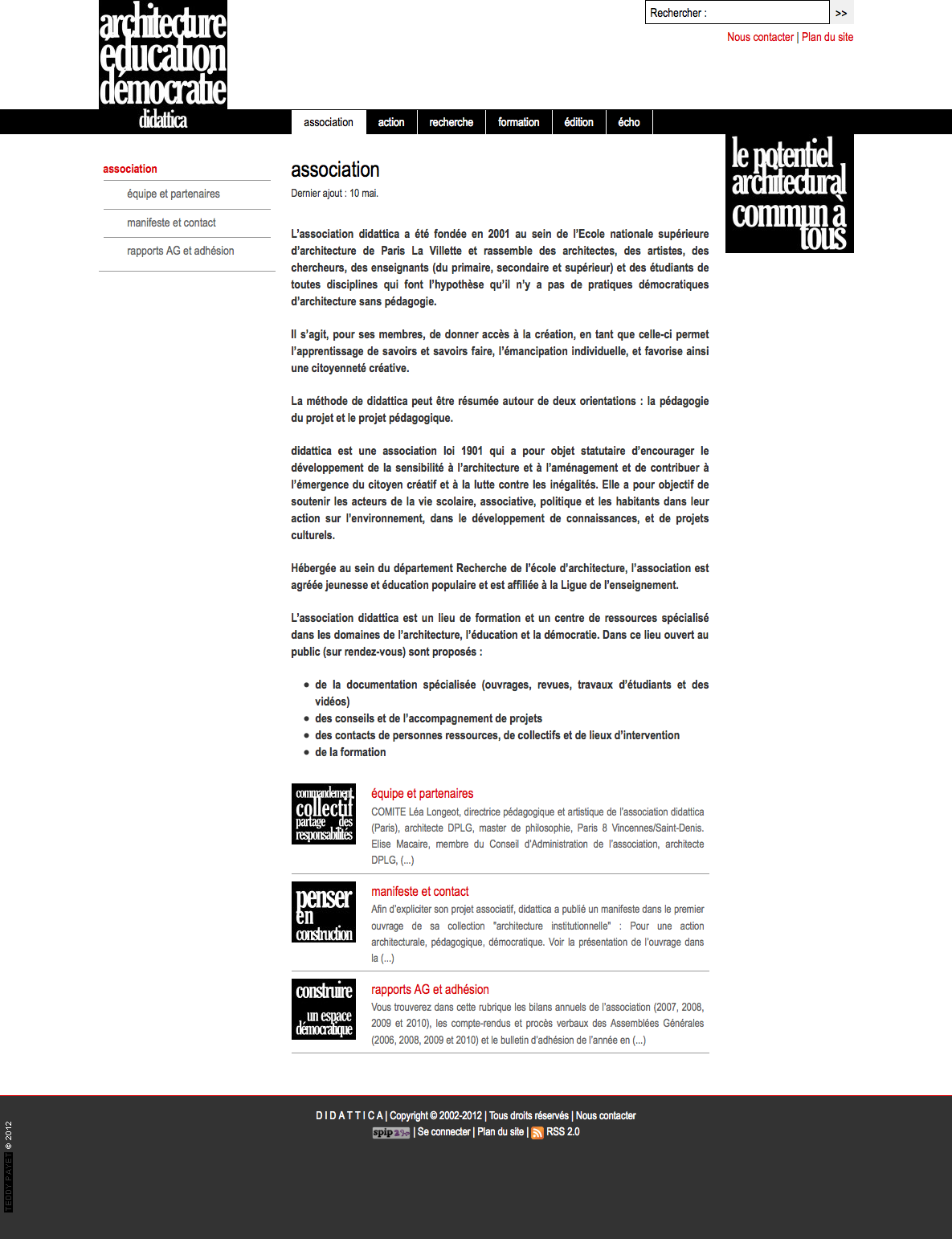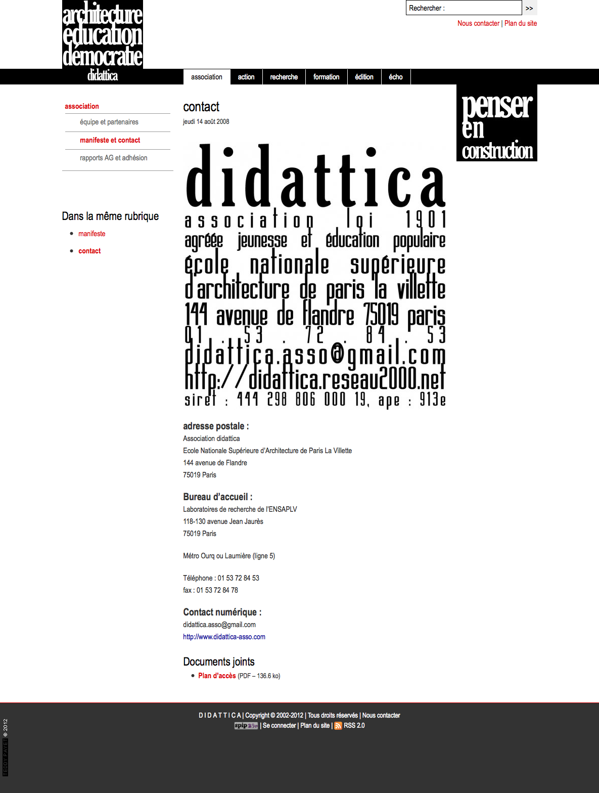 L’association didattica est un collectif qui travaille à la croisée de l’architecture, de l’éducation et de la démocratie, avec comme mot d’ordre "pour une prise de position de tous et de chacun dans le monde physique, social et mental". Elle rassemble des architectes, des artistes, des chercheurs, des enseignants (du primaire, secondaire et supérieur) et des étudiants de différentes disciplines.