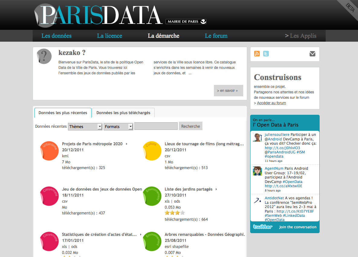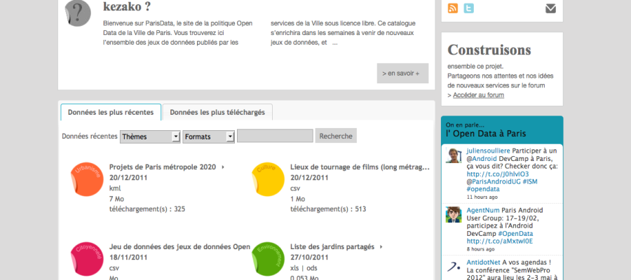 Depuis le mois de novembre, je m’intéresse à la vague de l’Open Data en France. L’Open Data (une donnée ouverte), selon Wikipedia, est une information publique brute, qui a vocation à être librement accessible. La philosophie pratique de l’open data préconise une libre disponibilité pour tous et chacun, sans restriction de copyright, brevets ou d’autres mécanismes de contrôle.