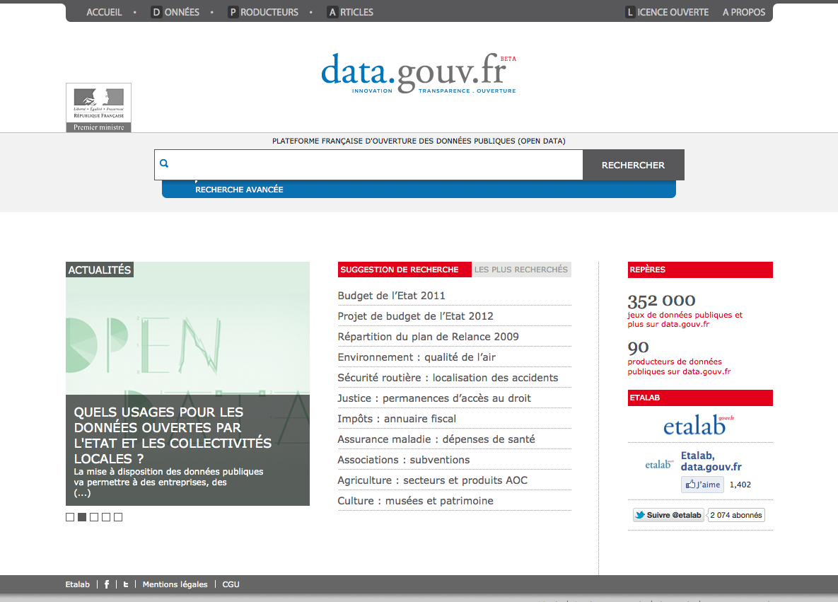 Vous n’êtes certainement pas passé à côté de l’arrivée en ligne du site data.gouv.fr, le site officiel du gouvernement pour l’Open Data. Il a été réalisé par Etalab, une mission sous l’autorité du Premier Ministre chargée de l’ouverture des données publiques et du développement de la plateforme française. Ils ont réalisé plusieurs ateliers de travail autour de l’ouverture des données, constituant la charnière de data.gouv.fr.
