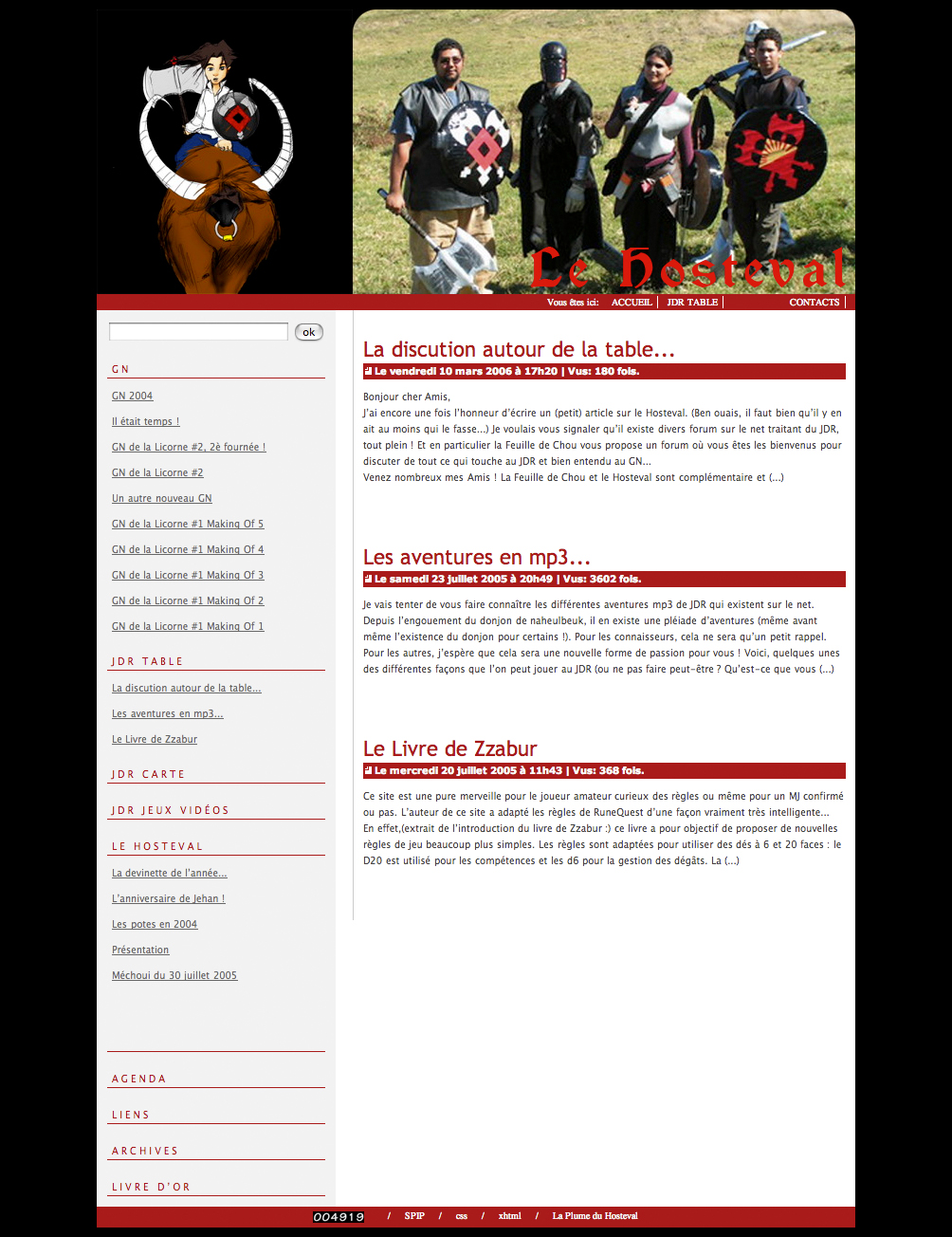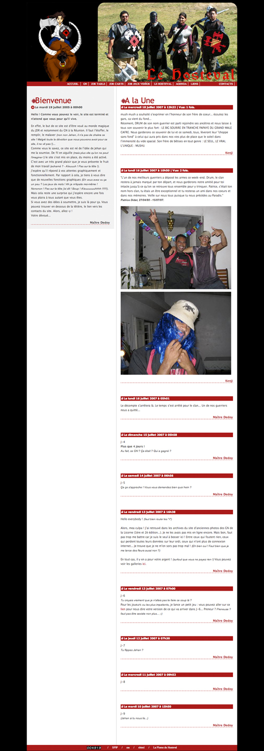 Le Hosteval Création d’un blog pour un groupe de joueurs de GN (Grandeur Nature) réunionnais. mercredi 20 juillet 2005 par Teddy Payet Langage et développement CSS, XHTML Bases de données MySQL Frameworks SPIP Logiciels Photoshop, Dreamweaver Catégorie Web Design Clients Amis Poste(s) Intégrateur, Graphiste Statut Personnel