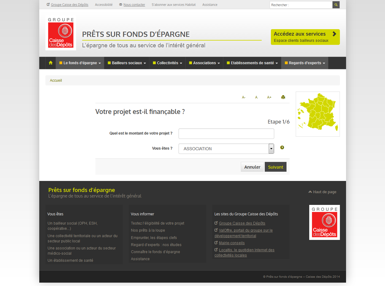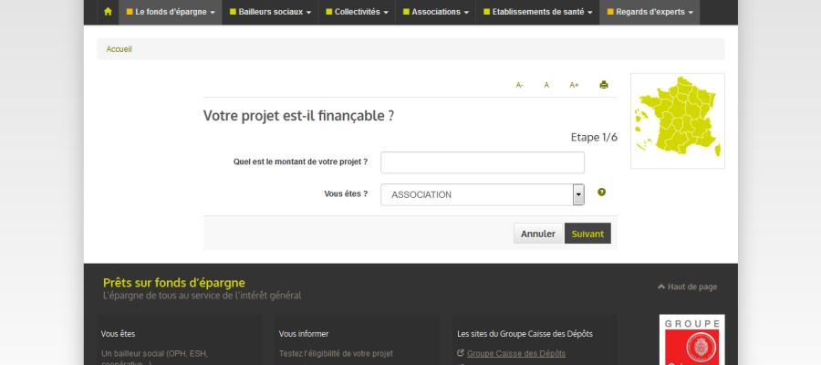 J’ai développé pour ce site le formulaire d’évaluation d’un projet qui détermine le prêt associé. Création de formulaires CVT multi-étapes, nouveaux objets éditoriaux que les administrateurs peuvent mettre à jour selon leur besoin et les dispositifs en place.