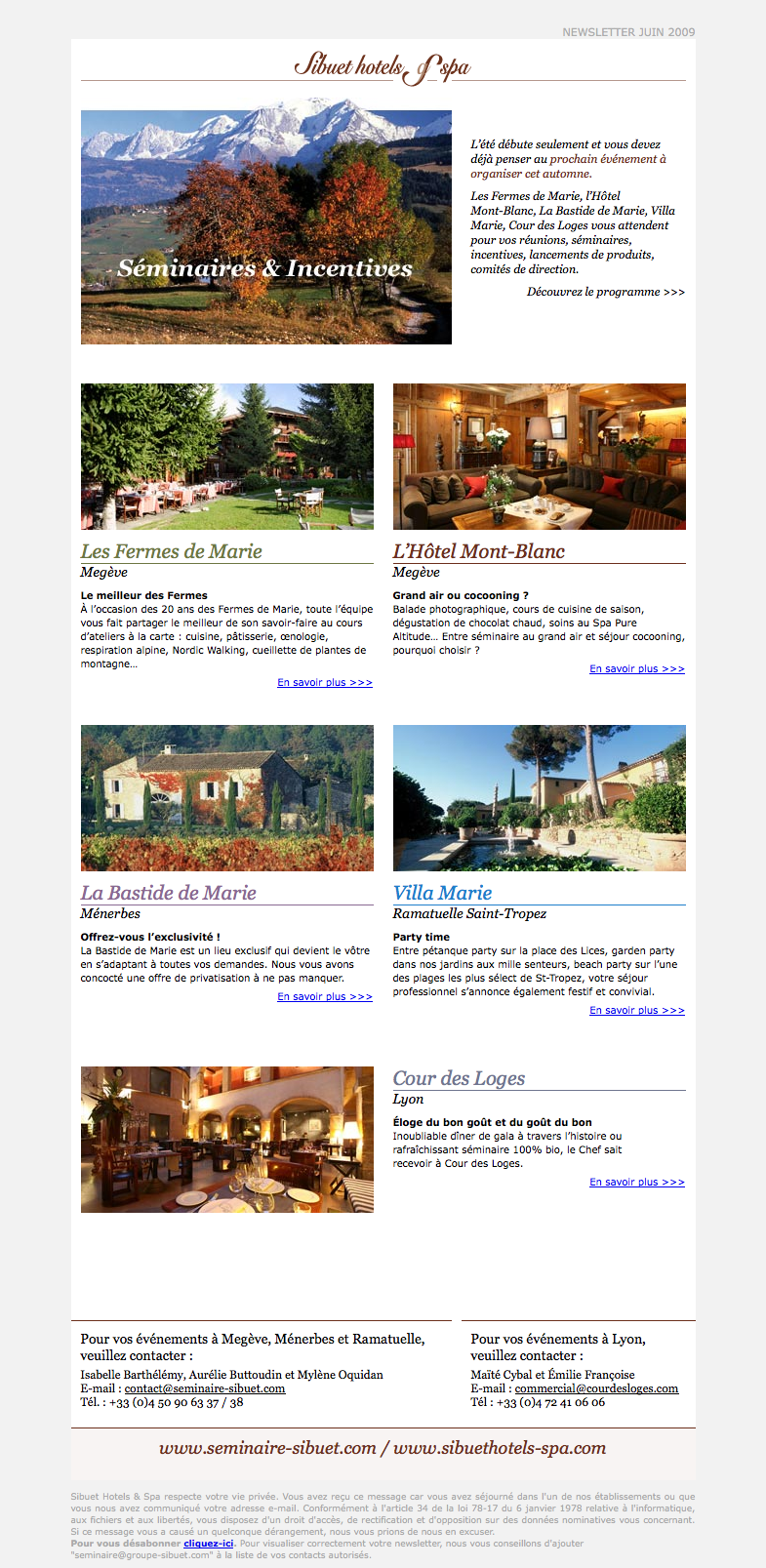 Réalisation de la campagne emailing des "Séminaires et Incentives" 2009 de Sibuet Hotels & Spa. La composition de la campagne est :
