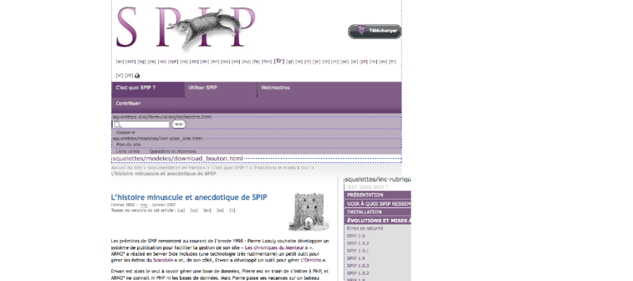 Depuis SPIP 2, il existe un mode très intéressant pour retrouver ses petits : var_mode=inclure. Cet aide au débuggage s’est amélioré au fur et à mesure. Mais il n’est pas aisé de retrouver la liste complète des squelettes (noisettes, inclure, etc.) en un seul endroit et un seul regard.