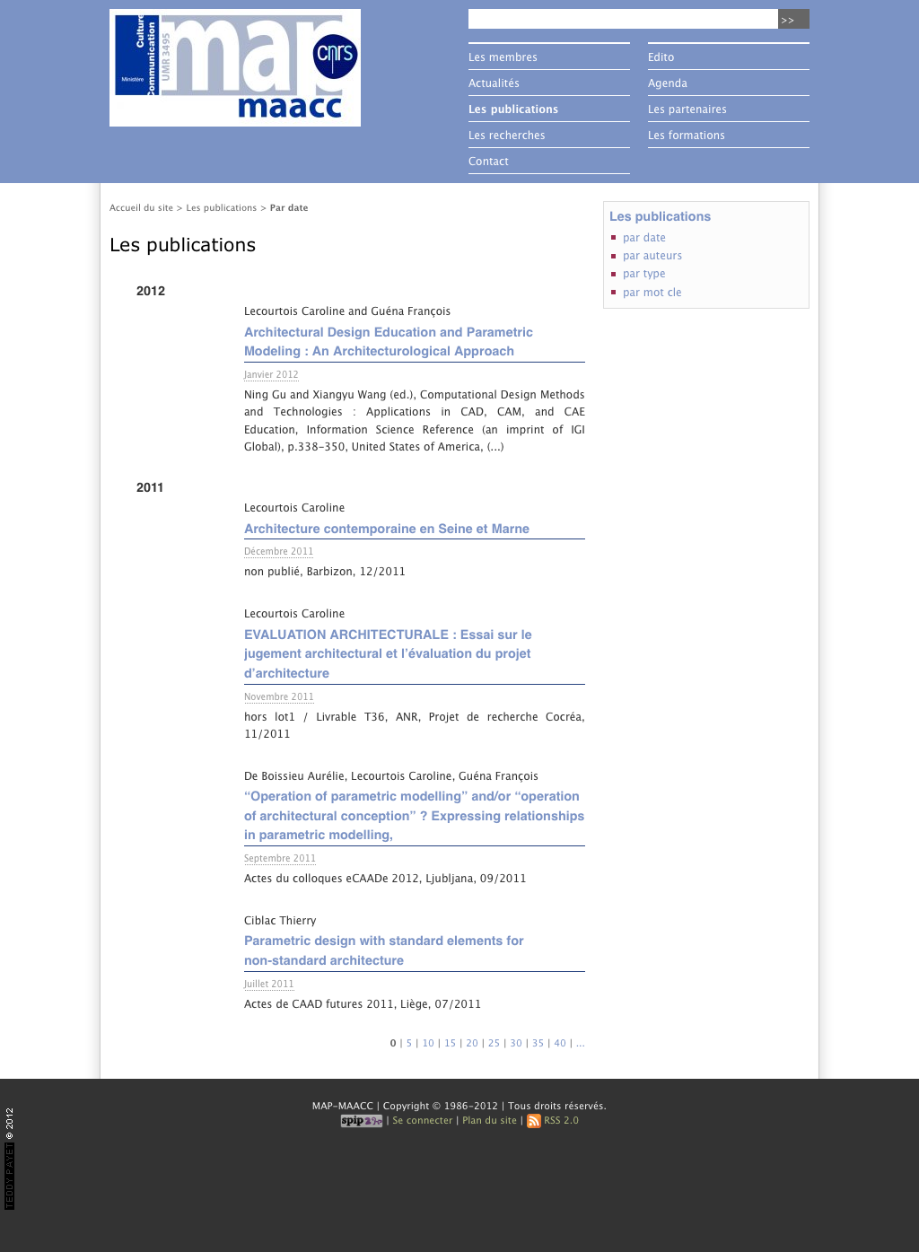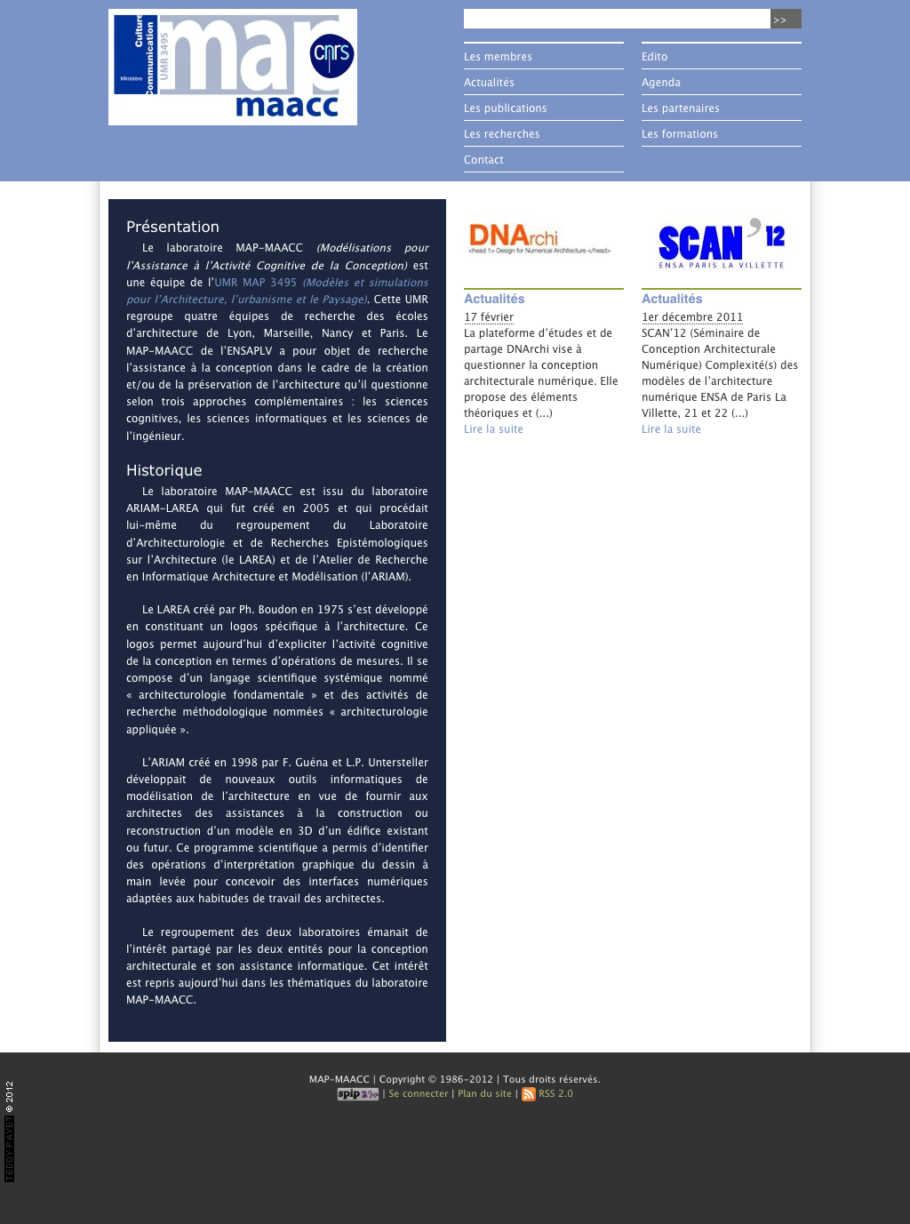 Le site a été porté sous SPIP 2.1.12 pour permettre une recherche transversale des différents laboratoires de l’école. La mise en page du site sert de gabarit pour tous les autres laboratoires. Les couleurs changeront selon le laboratoire mais les fonctions restent les même.