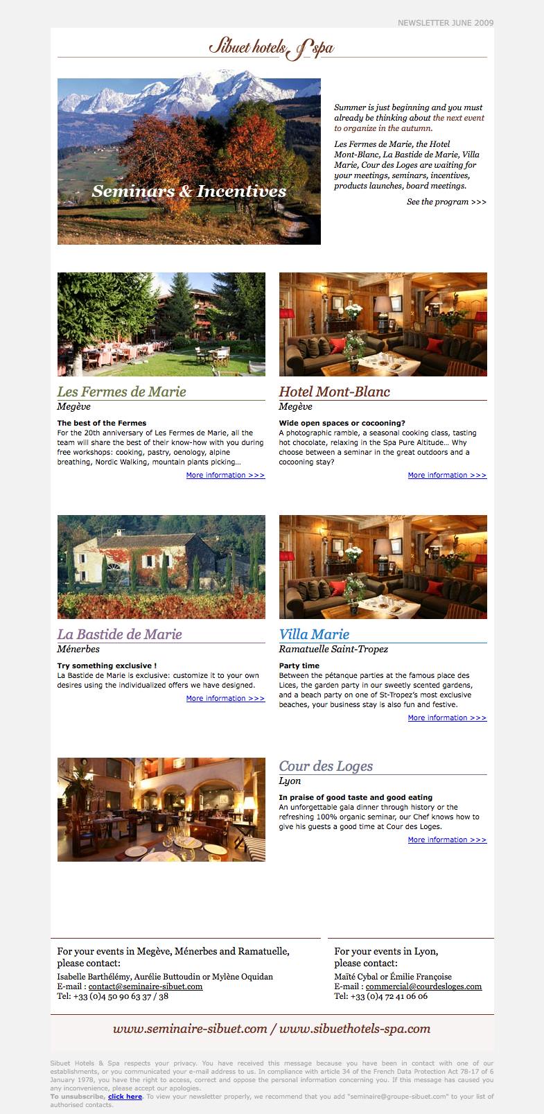 Réalisation de la campagne emailing des "Séminaires et Incentives" 2009 de Sibuet Hotels & Spa. La composition de la campagne est :